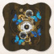 Composición de reloj de vapor redondo con dial numérico romano negro, decorado con arcos de oro y latón, mariposas morfo azules y lentes dañadas sobre fondo rayado marrón. Estilo Steampunk.