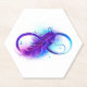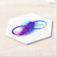 Símbolo infinito con una hermosa pluma pintada de color violeta y azul brillante sobre fondo blanco.