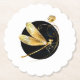 Pintura artística, oro, joyería, libélula espumosa con alas detalladas, filigree sobre flor silvestre dorada, contra círculo texturado negro. Lluvia dorada.