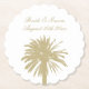 Lujosas casetas de bodas formales en la playa con la huella de palmeras. Plantilla de diseño exótico con silueta tropical de palmeras. Personaliza con nombres de novios y novios más fecha de matrimonio Parte de un hermoso tema de emparejamiento que incluye decoración elegante de mesa y elegante papelería. Color beige de arena neutra. La paleta de color se puede cambiar para que coincida con el tema. Decoración de mesa de lujo para un día especial. Forma de corte de vieira redonda opcional.