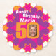 50.os prácticos de costa del papel de fiesta de cumpleaños del amarillo púrpura, rosado y anaranjado. Grande añadir un tacto personal a un 50.o fiesta de la celebración del cumpleaños de la sorpresa. Personalice con su foto de los chicas del cumpleaños en el 0 de 50 y personalice con su opción del nombre. Diseñe por Sarah Trett para www.mylittleeden.com