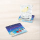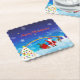 Hermoso paisaje de nieve con un árbol de Navidad, copos de nieve y un arcoiris sobre el cielo. Santa Claus está ondeando y dos renos están colgando juntos para distribuir regalos de Navidad.
