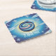 This coaster features a serene digital art image for the Schumann Resonance 7.83 Hz as a celestial phenomenon. The center of the composition shows a vibrant, swirling nebula of soft blue and violet hues visually representing the Earth’s resonant frequency with a stylized, pale blue planet behind it. Metallic silver stars and ethereal ribbons and stylized crescent moons are in the background. The background fades into indigo, illuminated by subtle lighting, creating a professional and calming visual representation of Schumann Resonance 7.83 Hz. The coaster is a scalloped square paper pulp coaster. There are six coasters in the coaster set.