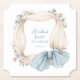 Protect your surfaces with a touch of boutique elegance using these Silly Goose Blue Floral Paper Coasters. This high-end design features a voluminous, cream-colored ribbon wreath accented by a delicate crown of watercolor blue wildflowers and soft peach blossoms. A large, beautiful blue bow with a subtle star pattern serves as the sophisticated focal point at the bottom of the design.