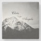 Boda blanco y negro bajo las montañas. Fotografía paisajística de una montaña cubierta de nieve con oscuridad abajo y cielo blanco nublado arriba. Los nombres de la pareja están en letra negra encima de la montaña en el cielo y todos los detalles están en letra blanca debajo de la montaña. Personalizable completo y productos bodas personalizables.