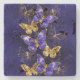Composición de lujosas mariposas de zafiro y joyas de oro sobre fondo de textura azul.