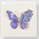 Joyería, azul, zafiro, mariposa floral brillante con ala decorada con flores azules y preciosas con hojas de oro sobre fondo blanco.