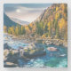 Una montaña rusa de piedra con una fotografía pintoresca que muestra montañas cubiertas de árboles en colores otoñales. Un río vibrante fluye alrededor de una multitud de rocas.