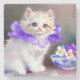¡Pascua de piedra con un gatito blanco magnífico! Un gatito mullido lleva un collar de flores moradas. Un tazón azul de flores blancas y moradas se sienta a la derecha. Un regalo maravilloso para los amantes del gato y del arte victoriano.