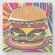 Al estilo de Henri Matisse, la hamburguesa se representa con colores llamativos y vivos y formas orgánicas simplificadas. El bollo es un amarillo claro y dorado con bordes suaves y redondeados, mientras que la parte es un marrón rico y profundo, texturado con brochas sueltas y expresivas. Crisp, lechuga verde vívida y rodajas maduras, de tomate rojo salieron del bollo, sus formas exageradas y estilizadas. El fondo es de color plano, contrastante, quizás un azul intenso o rojo, con motivos decorativos, abstractos, que le dan un toque caprichoso y moderno a la composición.