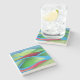 Un paisaje abstracto con colores y texturas vibrantes que muestran colinas flotando sobre el hielo en tonos verdes, azules, cian, rojo y rosa.