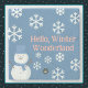 A Slice of Life and Delight presenta a las galeras de piedra Winter Wonderland con un muñeco de nieve blanco, escritura rosa y fondo azul. Las galeras de snowman también tienen un gorra azul y una bufanda.
