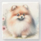 Un perro panomerano esponjoso con un naranja vibrante y un abrigo blanco, con grandes ojos expresivos y una expresión alegre. Está rodeado de flores suaves de color pastel y de suaves salpicaduras de acuarelas que crean un ambiente cálido y acogedor. El fondo es claro y ventilado, realzando el pelaje esponjoso del perro y su comportamiento lúdico.