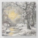 Pintura de bosque de invierno nevada que captura un momento de puesta de sol con un manantial de agua cruzando el suelo blanco, una casa y un ciervo escondiéndose detrás de un árbol.