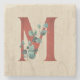 Diseñado para una decoración moderna de estilo rústico y campestre, esta carta/inicial ilustrada presenta un fondo claro de madera falsa, con una letra M rellena de madera roja granizada, acentuada por un tallo acuarela de hojas de eucalipto.