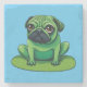 Pug verde lindo que se parece a una rana sentada en un lililipad. Se puede cambiar el color de fondo.