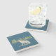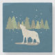 Un diseño Minimalista de un lobo blanco que aullaba con la nieve y el fondo de un bosque de pinos.