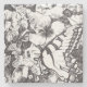 Dibujo en blanco y negro con mariposa y flores.