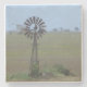 Molino de viento de estilo antiguo en un campo rural. Los extensos campos de cultivo atraen la mirada hacia los árboles en el horizonte y hacia el cielo azul pálido.