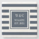 Posavasos con monograma de iniciales personalizadas que presenta un patrón de franjas azules marino y blancas con tus iniciales y apellido con la fecha de establecimiento en un cuadrado con borde azul marino y texto blanco clásico. Diseñado por Thisisnotme©