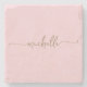 Elegante Chic Moderno Monograma de Nombre Personalizado en Letra Script Personalizado Posavasos de Piedra. Este diseño presenta un nombre personalizado en una caligrafía cursiva con fuente de cola swash (o tipografía) en dorado sobre fondo de color rosa claro o rosa bebé. Estos son fáciles de personalizar. Gran regalo elegante y femenino para inauguración de hogar, boda, también para cumpleaños, despedida de soltera, fiesta de cumpleaños de sweet 16, día de la madre y es para la chica que ama cosas únicas y elegantes.