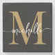 Posavasos de piedra personalizados con elegante diseño moderno y femenino en negro y dorado con monograma inicial de nombre y apellido. Este diseño presenta su primer nombre en una bonita tipografía de letra manuscrita con florituras (o caligrafía) con monograma inicial en dorado y blanco sobre negro. Estos son fáciles de personalizar. Gran regalo elegante y femenino para inauguración de hogar, boda, también para cumpleaños, despedida de soltera, fiesta de cumpleaños de 16 años, día de la madre y es para la chica que ama cosas únicas y elegantes.