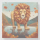 Este diseño creativo presenta un león macho hecho enteramente de hojas de otoño parado en un lago con una hermosa reflexión.