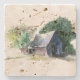 El granero está escondido entre los árboles verdes. Acuarela de un granero rural entre los árboles. Impresión de la acuarela original hecha por John A. Muir.