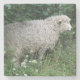 Esta impresionante montaña rusa de piedra muestra una fotografía de una linda oveja esponjosa. La oveja está rodeada de flores silvestres y de hierba larga y se come codiosamente algunas hojas. Tiene un grueso abrigo blanco de lana y una nariz negra linda.