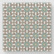 Una posa vaso con estampado con un vaso de agua y rodaja de limón descansa sobre una superficie gris. El posa vaso tiene un diseño geométrico en verde azulado, marrón y blanco.
