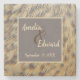 Esta posavasos cuenta con una foto de estampado animal de plumas de pato hembra. Las hermosas plumas moteadas de oro y marrón oscuro se curvan y fluyen verticalmente en este posavasos. Un cuadrado sólido de color beige y gris en el centro proporciona el fondo para los nombres de los novios y la fecha de la boda.
