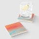 Un diseño abstracto de una puesta de sol del océano con colores llamativos en rojo, naranja, cian, azul y beige.