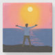 Saludo al sol. Un hombre está parado en una playa frente al mar abierto y saludando al sol amarillo con los brazos levantados.