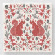 Two red squirrels in a forest of oak leaves, pine cones, fir branches and berries. Original art by Nic Squirrell.
