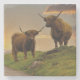 Vacas de las tierras altas paradas en una colina al atardecer. Una de las vacas sacando la lengua.