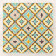Abstract geometric pattern with diamond shapes in pastel colors. Each contains a star-like motif in teal, orange, or brown. Retro and symmetrical design.