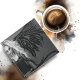 Un ángel de ojos rojos de cabello blanco con alas tribales negras en tonos blanco y negro