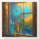 Atrapasueños boho azul y naranja bonito con plumas y cuentas colgando en una ventana con una bonita escena al aire libre. Se utilizó inteligencia artificial en el estilo de ilustración.