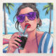 Monasterio de papel pop de playa. Un lindo libro de historietas personalizado ilustracion de una mujer tomando un refresco en la playa con gafas de sol moradas, bandana y bikini.