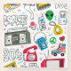 El doodle de los años 90 de la época de los años 80 con boom box, televisión, cassette y otro objeto. Un estallido de nostalgia retro con cajas de boom, casetes y más. ¡Moderno y vibrante! Doodles nostálgicos retro de los años 80 y 90: reproductores de cassette, boombox, y más! doodle, 90, 80, patrón, ilustracion, retro, vintage, amor, boombox, deporte, radio, zapatillas, teléfono, pop, sketch, música, clipart, diskette, papel, decoración
