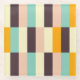 A colorful, geometric pattern with vertical stripes in teal, cream, peach, dark brown, and orange arranged in rows. The design conveys a retro, vibrant feel.