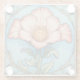 Flor de amapola rosa de inspiración Art Nouveau con hojas y tallos verdes, fondo azul claro con elementos florales decorativos en las esquinas, estilo vintage, composición simétrica.