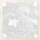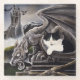 El gatito de esmoquin blanco y negro está sentado al lado de una gárgola. Detrás de ellos hay un castillo y dragones.