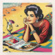 Mujer de arte pop retro con un vestido de mediados de siglo al estilo de los años 50 tomando un cóctel y soñando con la moda leyendo una revista en la playa. ¡Diversión para una fiesta de cumpleaños retro!