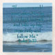 Este muy conocido pasaje de Lucas 9:23 habla de las palabras de Jesús cuando no solamente llamaba a Sus discípulos a seguirlo, sino también de lo que estaban a punto de pasar —tener que negarse a sí mismos— todos ellos, a seguirlo. Esta foto que tomé mientras estaba en la playa me recordaba a esos pasajes, y sólo era apropiado que Lucas 9:23 estuviera en un fondo tan hermoso de la costa, recordándonos los días que Jesús pasó enseñando en Galilea. Los colores de los diferentes tonos azules y verdes, tanto en los colores de los tipos de letra como en el cuadro, mezclados con el agua de espuma blanca, crean una bonita escena decorativa que también es tan apacible y acogedora.