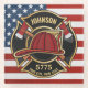 NOMBRE DEL bombero Fuego Departamento de Bomberos de EE.UU. Diseño de la bandera - Emblema con casco rojo y hacha. Personalizar con su nombre, número de estación/departamento y ubicación.