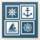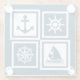 Diseño de temática náutica con velero, velero, brújula y decoración de ancla en cuadrados de rayas blancas y azules