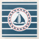 Diseño náutico con decoración de velero en forma redonda sobre fondo de rayas azules y blancas