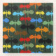 Un grupo de dragones en los colores de la mosca negra, marrón, roja, naranja, amarilla, azul y verde abren las alas a través de un fondo verde oscuro que se eleva hacia arriba. Los dragones son dibujados al estilo de un tatuaje tribal.