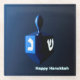 Un modernístico dreidel azul metálico contra un fondo oscuro y nocturno. Dos de las letras hebreas encontradas en un dreidel, una monja y un shin, brillan brillantemente. El texto que dice "Feliz Hanukkah" también aparece en azul brillante y blanco.